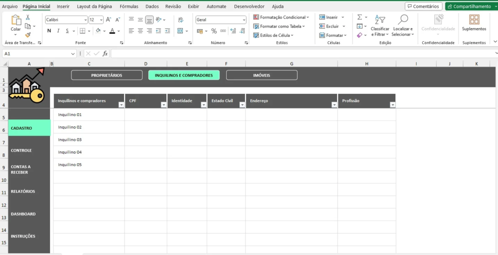 Na Planilha Controle Aluguel De Imóveis em Excel todas as informações essenciais já estão prontas para o preenchimento