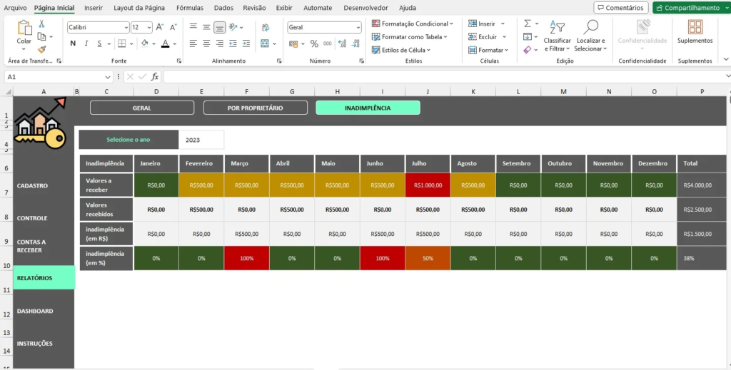 Veja este exemplo da Planilha Controle Aluguel De Imóveis em Excel como é visualmente facil de analisar as informações dos pagamentos e inadimplencia