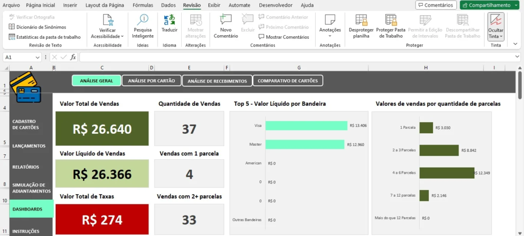 - Análise de Performance: Identificar tendências e padrões nas vendas por cartão de crédito pode ser difícil sem ferramentas adequadas. Com recursos de análise embutidos, uma planilha permite uma avaliação detalhada do desempenho, facilitando a identificação de áreas de melhoria.