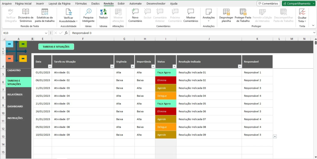 Veja neste exemplo da Planilha Matriz de Urgência Importância Eisenhower em Excel como pode ser simples realizar a organização