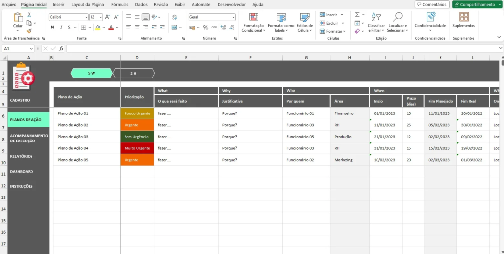 Veja este exemplo de planilha pronta a Planilha Plano de Ação 5w2h