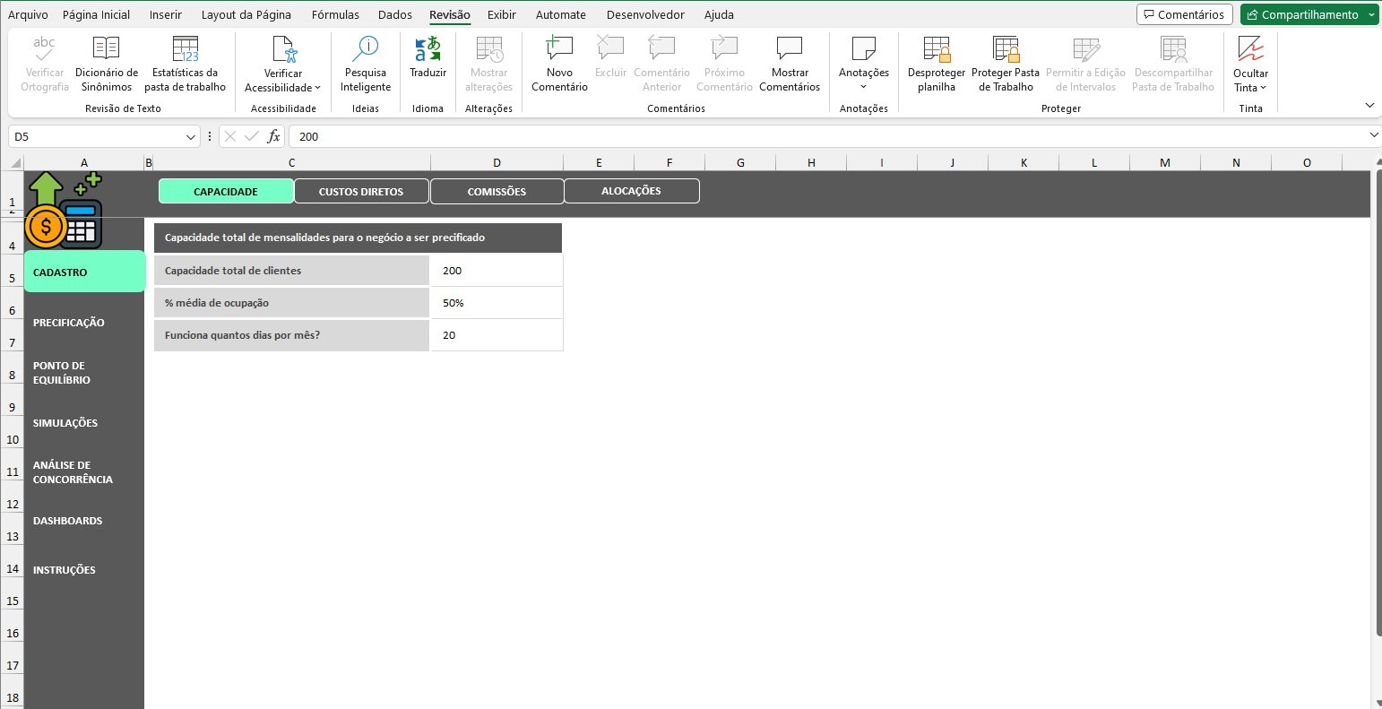 O primeiro passo para precificar a mensalidade é definir a capacidade total de clientes, o percentual médio de ocupação, custos diretos, comissões e a alocação de profissionais para realizar o serviço. Nossa planilha permite que você: