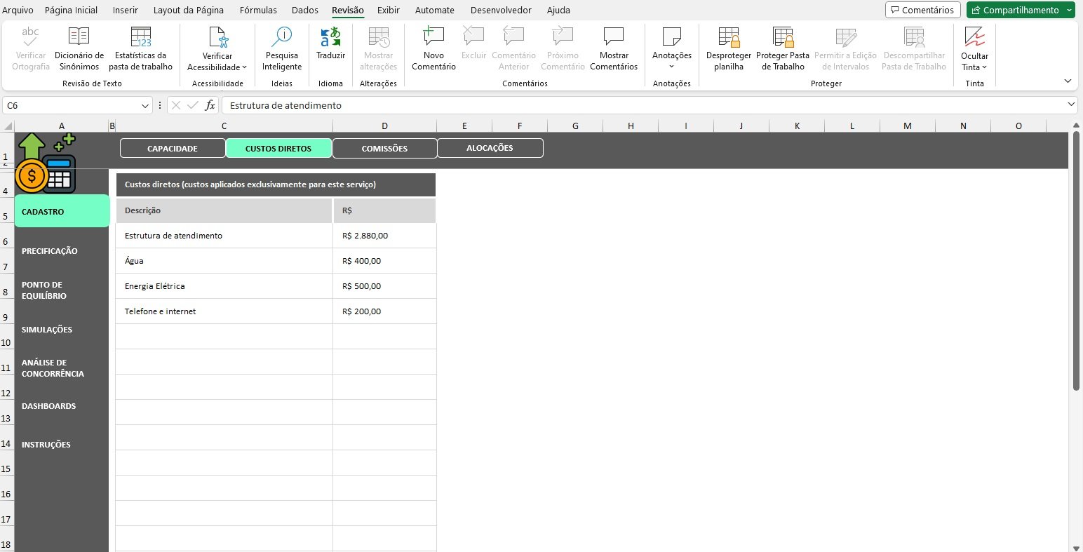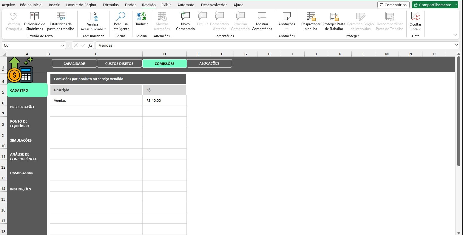 Com os dados iniciais cadastrados, você poderá analisar o custo total e definir uma margem de lucro para compreender como o preço final se comportará de maneira geral. A planilha ajuda a: